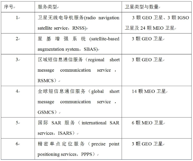 北斗三号系统提供的六种服务及其参与服务的卫星数量分布