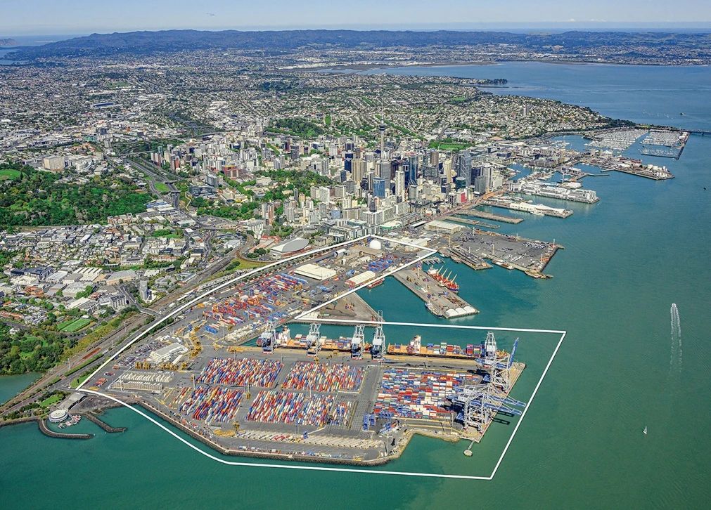 在奥克兰中央商务区门口的奥克兰港口占地140英亩。轮廓线显示了位置网(LocataNet)本地定位系统的大致覆盖范围(仅限于地面)。(照片:罗斯·克拉克/奥克兰港口)